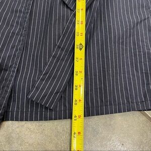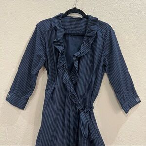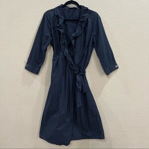 The 90 Spiegel Black Stripe Ruffle Collar Wrap Dress in size 14 is a versatile and stylish piece perfect for various occasions. With a collared neckline, 3/4 sleeves, and button closure, this dress exudes a dark romantic vibe, ideal for those who appreciate goth, grunge, and punk aesthetics. Made from cotton with a canvas fabric type, it features pleated and button accents, a midi length, and pockets for added convenience. Whether you're traveling, attending a party, or just dressing for casual wear, this dress is a standout choice that will make a statement.