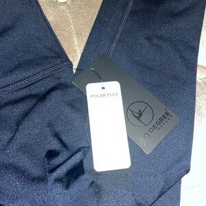 90° by reflex leggings that are navy colored, and have fleece inside! These are a size small and are brand new with tags. These are full length with a 28 inch inseam and they are moisture wicking, have four-way stretch, a high waist and great compression. I love the way these leggings are designed. They actually are not just perfectly straight legs. They are wider at the calf and at the thigh, so they really give you a beautifully flattering fit. The fleece on the inside on these is super warm. These are the perfect leggings for colder weather. Whether you’re wearing them for a workout, running errands, or just hanging out around the house. These are a really nice fabric that feels great and has enough compression but not too much that they aren’t comfortable.