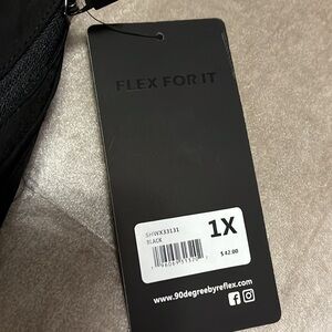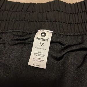 Brand new with tags 90° black workout shorts. This feature is a drawstring waist band, zipper pocket at the front, and a panty liner so you don’t need to wear underwear if you don’t want to, in a nice black comfortable fabric that will last for many many workouts. The zipper pocket is only on the left-hand side, there is no pocket on the right side. Please see photos for measurements, these are a size 1X.
