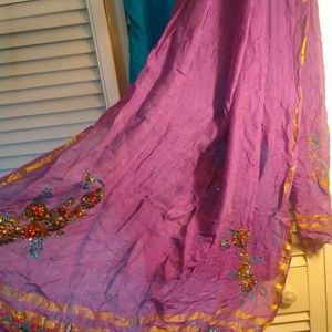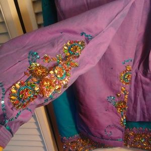 Price firm!Beautiful turquoise and two tone purple salwar with heavy multicolor work.It's a custom hand made dress!Dress lenght 35 inches,Chest 34 inches.Salwar/pant 36 inches lenght.
