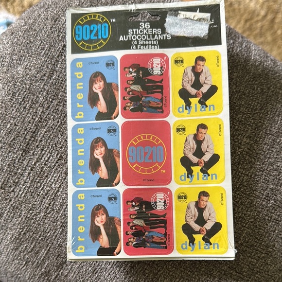Vintage 36 colorful 90210 stickers featuring characters and logos. Perfect for fans and collectors. 4 sheets of stickers