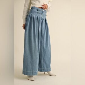 High waisted, denim pleated, wide leg pants. Super soft material. A little bit stretchy.