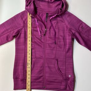 Stay comfortable and stylish in this 90 Degree by Reflex woman’s full-zip hoodie jacket. Designed in a vibrant magenta/purple striped pattern, this hoodie is perfect for casual wear, workouts, or layering on cooler days. Features include a drawstring hood, zip-front closure, front pockets, and a small sleeve zip pocket for convenience. The stretchy fabric ensure a comfortable fit while offering a flattering look. Perfect for gym, yoga, athleisure, or everyday casual wear. Excellent condition. No stains. No holes or tears. Smoke free home. Fast shipping. Open to reasonable offers.