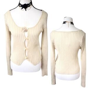 3.NEW WITH TAGS URBAN OUTFITTERS KIMICHI BLUE CREAM ROSE BUTTON UP CARDIGAN. MARKED XL, RUNS SMALL.