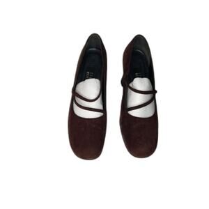 90S Vintage All Leather Stuart Weitzman brown suede leather Maryjane pumps with a block heel. Two thin leather stretchy straps cross over top of the foot.