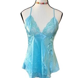 2) Y2K VTG. FREDERICKS OF HOLLYWOOD BABY PASTEL BLUE SATINY LACE BOW CAMI TOP MEDIUM EUC. STUNNER!!