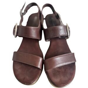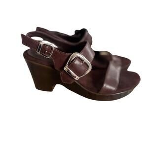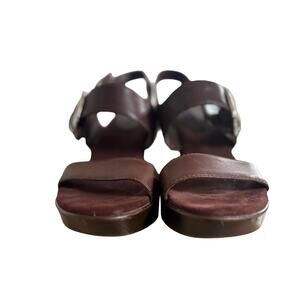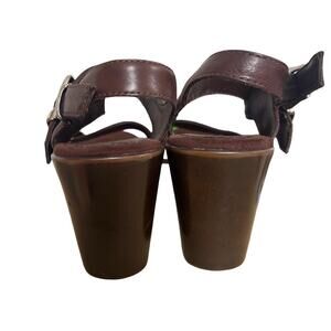 SO CUTE! BROWN LEATHER UPPER, SOFT CUSHION FOR THE FOOT, LARGE SILVER TONE ADJUSTABLE BUCKLE STRAPS, 3" HEEL 1" PLATFORM.