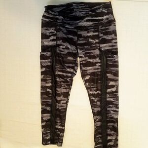 Small yoga capris with three pockets and sheer panels down the legs. the inseam is 22 inches, capris.