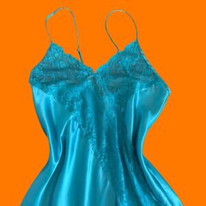 90's 00's vintage blue satin 100% polyester sheer floral lace y2K slip dress M