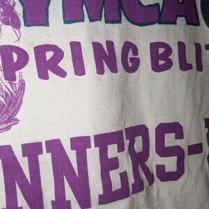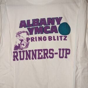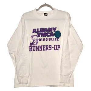 Description: Vintage 90s Albany YMCA Springblitz Runners Up Volleyball Long Sleeve t-shirt, front graphic only, white and purple, sports tee, bunny rabbit design,