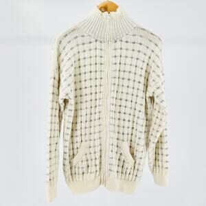 90s Alpaca Wool from Peru Ivory Gray Grid Knit Full Zip Sweater Cardigan