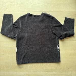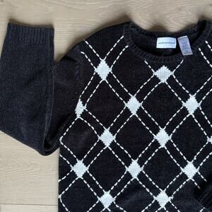 This 90s Black and White Women's Argyle Sweater is a size Large and Alfred Dunner brand. It is super soft and has some stretch. Preppy style or Whimseygoth aesthetic. It is in good preowned condition. Please see photos for details and measurements.