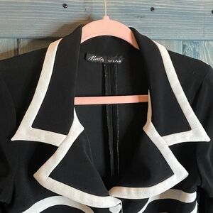 This modern blazer showcases a bold black base accented by striking white symmetrical lines on the front, creating a tapered effect. The structured design and full-length sleeves offer a sophisticated and polished look, perfect for any formal occasion.