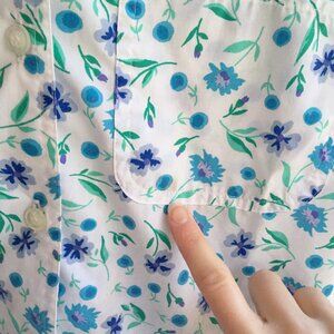 A 90s floral blouse from Cabin Creek! This short-sleeve, button down top is in good condition with a minor flaw: there is a faint stain at the corner of the chest pocket (see final pic). The material and size tag have been removed, but best suited to a Small and I would guess the material is cotton. Print is blue and green flowers on a white background. Still has its "spare" button attached in the inside.