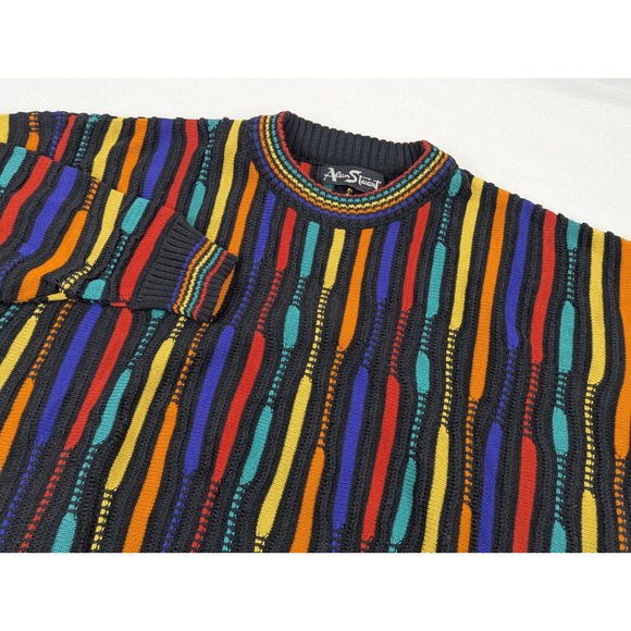 This retro 90s Cable Knit Sweater in men's size large features a colorful geometric pattern, perfect for casual or business occasions. Made of a blend of cotton and acrylic, this pullover sweater is machine washable and breathable, making it ideal for winter, fall, or spring seasons. With a classic crew neck and long sleeves, this vintage sweater from Alan Stuart offers a comfortable and stylish option for everyday wear.