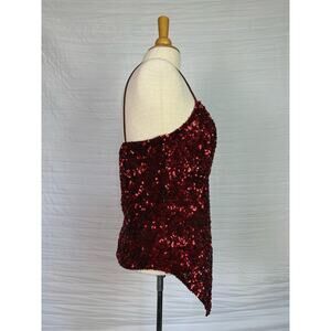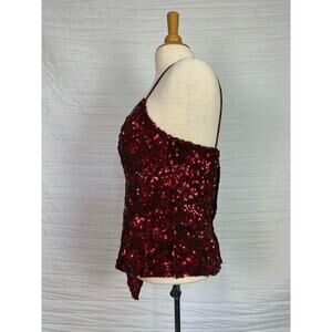 Incredible rust sequin tank with sassy asymmetrical hem. Perfect to add sparkle to any ensemble! I did not find any flaws to note. Zips fully down the back. Has hook and eye clasp at the top and bottom of the zipper.