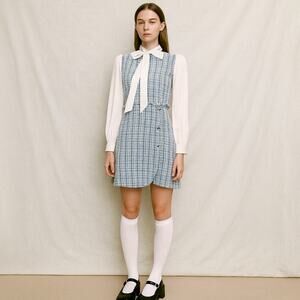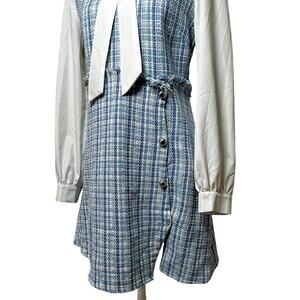 NWOT 90s Clueless Preppy Style Blue Plaid Tweed Jumper MEDIUM Dress with White Long Sleeve Blouse & Bow Tie. Clueless Cher Horowitz style.