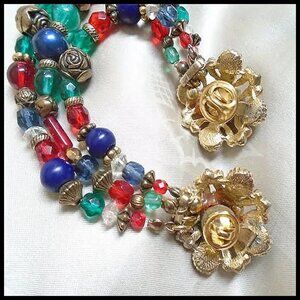 Do you like having something no one else can have? This one of a kind handmade collar pin / blazer brooch or beret decoration (and can be much more), is unused stock. It's not a design you see everyday. My records show that I made and sold a LOT of these and this is the last one (the next-to-the-last one - sold - is on the beret) unused stock, of course. Not really a sweater guard, but you may be able to wear it as one, if you don't pull on it. Made to be versatile, shown in different ways in photos (one lady said she would wear hers on a boot). It attaches with tie tack type pins with clutches, so be aware that it may make a small hole in your collar or jacket, like a tie tack. Vintage pieces at the ends were once clip on earrings. Three are three rows of misc vintage glass beads. Jewel tones! Will come in a gift box