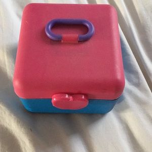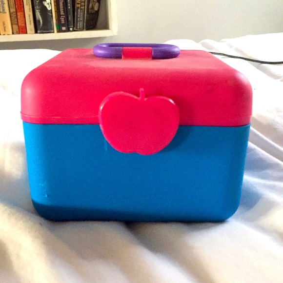 This was mine from the 90’s. Still in great condition. Purple, pink and blue color block design with apple “knob.” Great little storage case and small enough to take on the go!