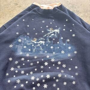 navy sweatshirt, winter print, bird motif, graphic cozy, vintage style, oversized fit, 90s inspired, celestial design, casual streetwear, soft fleece