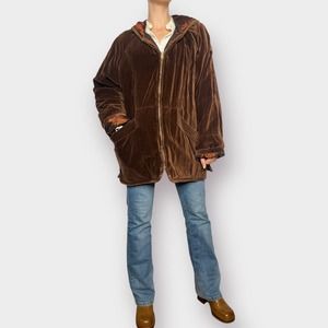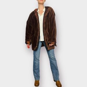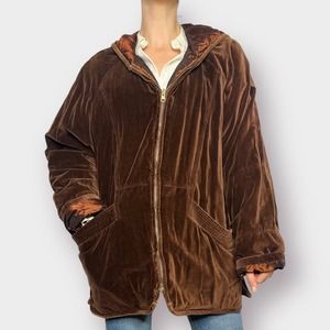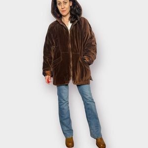 1990s copper and brown coat that can be worn two ways. One side is copper, quilted with a sheen. The other side is brown velvet. Front zipper closure. Detachable hood.