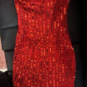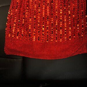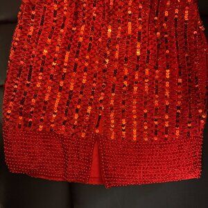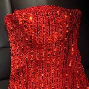 This show-stopping strapless cocktail dress features intricate hand-sewn red sequins and beads throughout for a shimmering, luxe finish. Fully lined with a fitted silhouette, mini length, and small back slit for movement. The bold crimson tone and sparkle make it the perfect New Year’s Eve or holiday party dress, while its craftsmanship keeps it timelessly chic.