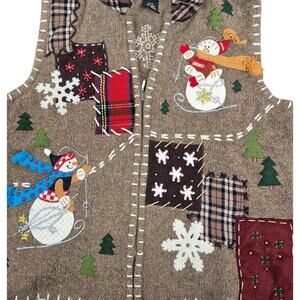 Check out this adorable vintage 90s Designer Originals Studio Joy Wool Zipper Vest! It's perfect for winter with its cute (or delightfully ugly!) Xmas patchwork design featuring charming snowmen. You'll love the excellent condition and the fun Size P/M, making it a wonderful addition to your seasonal wardrobe!