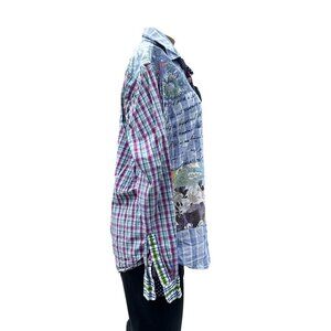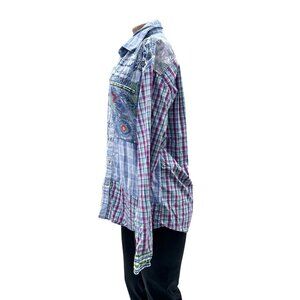 Tags: Desigual shirt, women's top, patchwork blouse, multicolor shirt, casual wear, plaid floral, button-up, long sleeve, unique design, cotton shirt, relaxed fit, fashion top, eclectic style