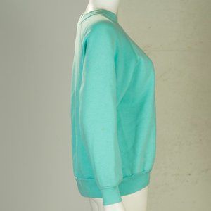 Adorable one of a kind vintage pastel sea foam green pullover sweatshirt with ornate embroidery. Features a hand embroidered smiling Teddy bear on their stomach surrounded by shopping back with the stylized pink text "Shop Til You Drop" in shades of pink, brown, and turquoise. In great vintage condition, no pilling and the fabric interior is still soft and warm with a buttery fleece-like texture. Label is Tultex