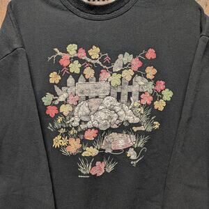 Description: Vintage 90s Fall Puppy Dog Granny Crewneck Sweatshirt, black white and multicolor, checkered double layered neckline, cute dog design, fall leaves, perfectr for fall and winter months, grannycore, grandma sweater