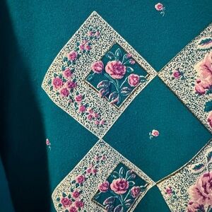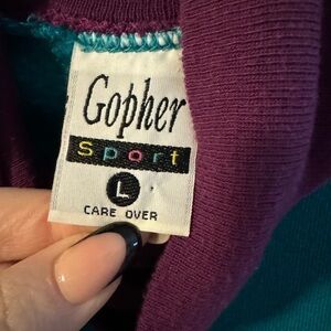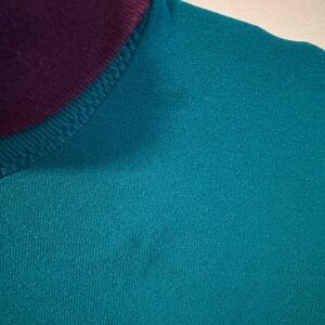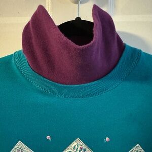 Vintage 1990’s Gopher Sport Made in USA size Large Floral Embroidered Painted Double Collar Turtleneck Crewneck Sweatshirt Top Oversized Grannycore Cottagecore Fall Back to School. Teal, purple & pink. Turtleneck can be rolled down or worn up for warmth. Paint is in excellent condition. Two very faint spots near top of right side neck as shown in 3rd photo and some area of pilling on bottom sleeve.