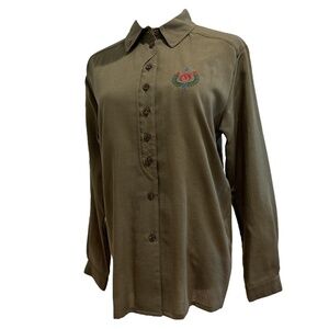 Vintage 1990s Geiger Collections lightweight woven wool blouse in olive green, exuding quiet luxury and a stealth wealth aesthetic. Crafted in Austria, this timeless piece features an army green with colorful embroidered design on the chest and decorative buttons.