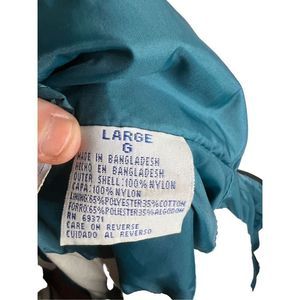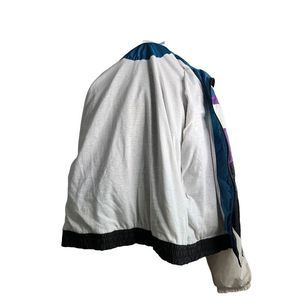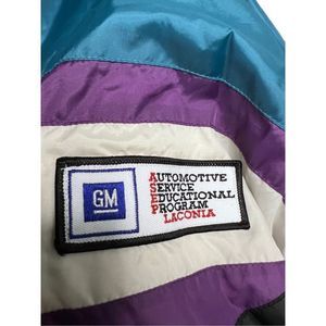 90’s Vintage Color Block Windbreaker Jacket. General Motors GM. Size Large. Brand is Athletic Mens Works. 100% Nylon. Made in Bangladesh. In excellent condition with no seen flaws. Fits true to size. Soft interior with water resistant exterior. Has two pockets. Zipper works well. True 90’s style with the color blocking of white, teal blue, black, and purple.