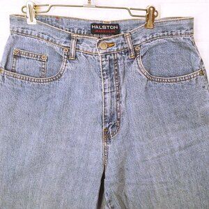 -- Halston Jeanswear made in Jordan inner care tag cut, women -L(12) 31x20, logo patch tags, high-waisted high-rise, flat-front, tapered relaxed baggy Leg, below knee capris with 2in slit, metal rivets Button Zipper, 5-pockets, easy care washable 100% cotton denim twill fabric in light wash blue colorway.