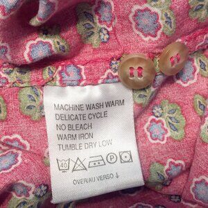 A 90s calico floral blouse from LizSport Petite! This short-sleeve, button up top is in excellent condition with no found flaws-- however, the material and size tag have been removed. Best suited to a Small, but depending on measurements, it could work for a Medium as well. I would guess the material is cotton. Print is a hot pink with periwinkle and green flowers. Silhouette has some darts in the shoulders. Still has its "spare" button attached in the inside.