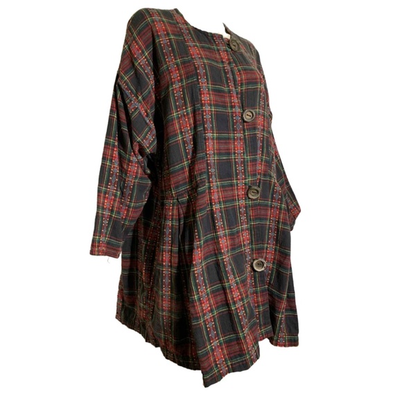 Divine soft plaid flannel coat style dress with large buttons, darts at sides of waist, long sleeves. By Su Zen.