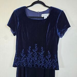 90s Jessica Howard Velvet Maxi Dress Short sleeve Women's 6 Blue Embroider Bead Dark Romantic Whimsigoth festive holiday feminine Forest fairy Y2K Preppy Old money