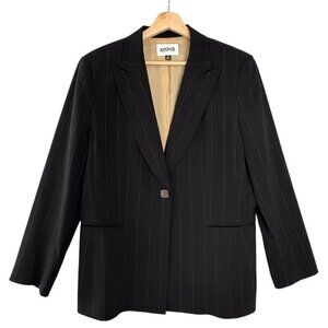 This Vintage late 90s Pants Suit by Kasper is constructed 53% Poly, 34% rayon, 3% Poly black with tan wide stripe fabric; both the jacket and trousers are fully lined. The jacket features a v neckline wide notch collar, pearl effect square single button closure, 2 front horizontal welt pockets and a longer past the bum silhouette. The pants feature an interior flat hook and eye zipper closure and a straight loose leg silhouette. This is office siren, corporate goth, day to night, work event, classic, quit luxury, wrinkle resistant, travel, minimalist, neutral vibes.