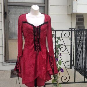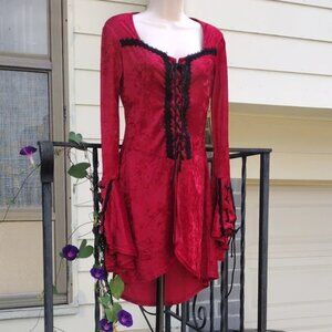I freaked when I found this amazing gothic top from Lip Service! I sold so much Lip Service in the 90s when I opened and managed the first Hot Topic in my city because they were the coolest clothes around! I styled many, many musicians in Lip Service, yes, I even sold some pieces to No Doubt when they stopped in while on tour in '97! This red velvet top laces like a corset on the bodice and also on the long bell sleeves. Below the laced bodice, the top is open. Overall, in great vintage condition, but please see the last picture and zoom. There are 2 runs side-by-side on the bodice 2.25" & 4" long which are difficult to see and photograph. They are under the sleeve about half down the bodice ending at the horizontal seam. Made in USA 90% poly, 10% spandex dry clean only, no bleach.