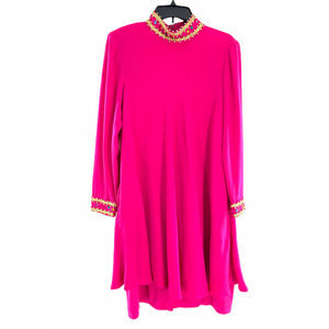 The perfect cocktail, holiday dress. This will be the dress that will have everyone stopping and staring, the bright pink color with the gold and gems around the neck go so beautifully and bring the dress together. This is a very unique dress and a must-have piece in your closet.