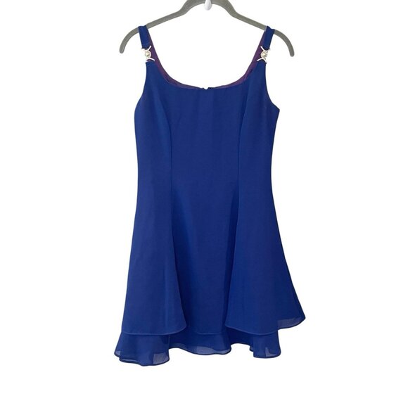 The 90s McClintock prom dress is a whimsical and glam eagerly wore piece perfect for a wedding, party, formal event, or even a summer or spring outing. Made from acetate with rhinestone accents on a blue solid color, this sleeveless dress features a scoop neck, zip closure, and a unique rhinestone strap design. The fit and flare style, with a tank dress silhouette and tiered glam details, exudes a classic and 90s vintage vibe. This dress is designed for petite women and should be dry cleaned only for maintenance. Made in the United States by Scott McClintock, this dress is a must-have for those seeking a fun and flirty outfit.