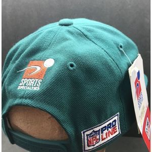 Show your love for the Miami Dolphins with this vintage Proline NFL Sidelines-SNAPBACK hat. The green cap features the team's official logo and colors, and is officially licensed by the National Football League. Made by Sports Specialties, this one size fits all hat is perfect for any NFL fan.