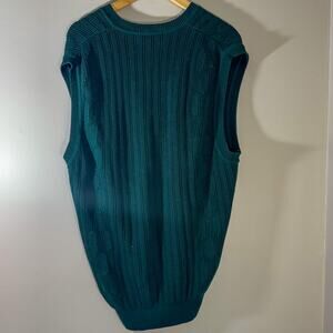 Elevate your wardrobe with this authentic vintage Michael Thomas Ltd. sweater vest. Crafted in the USA from luxurious 100% Egyptian Nile Cotton, this piece features a rich, deep teal/dark green color and a classic ribbed knit texture. The high-quality construction and premium cotton make it comfortable, breathable, and a standout layering item. The V-neck and sleeveless design are perfect for that classic prep, golf, or casual 90s aesthetic. This is a rare find from the Michael Thomas collection, perfect for adding a touch of vintage designer quality to your look.