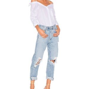 Experience ultimate comfort and style with Agolde's blue boyfriend jeans, featuring a relaxed fit and a classic denim wash. These jeans are perfect for a laid-back look, offering a blend of casual elegance and timeless appeal. The subtle distressing adds a touch of modern flair to this wardrobe staple.