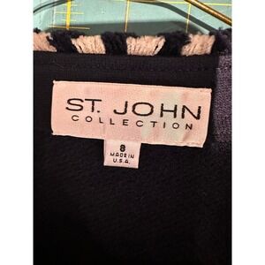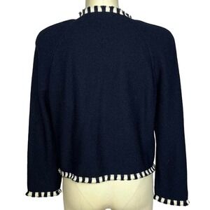 Super classy and chic navy cardigan by St. John! Has a fun navy and white fluffy trim. Marked as a size 8 but see measurements for fit.