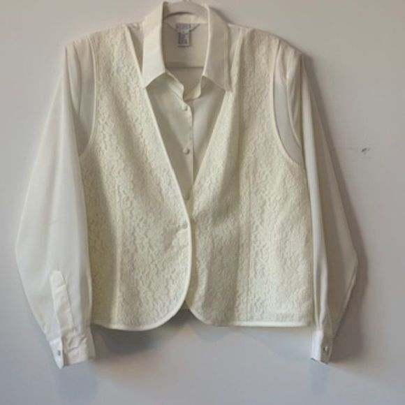 90s - Poly Blouse with Attached Lace Vest + Shoulder Pads