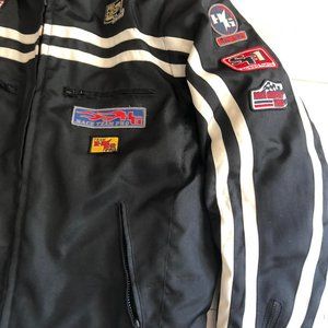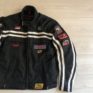 Super dope racing jacket with a lot of patches shown in the pictures. Beautiful stripes going all around the arms and check and back.YKK zipper.