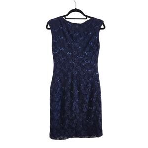 90's Ralph Lauren Floral Cowl Neck Sequin Lace Sheath Dress Navy Blue Size 6