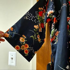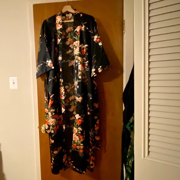 Silky smooth ankle length robe with tie at waist. Black with floral pattern. Like new, with no rips or stains. Send me an offer!✨