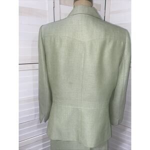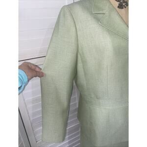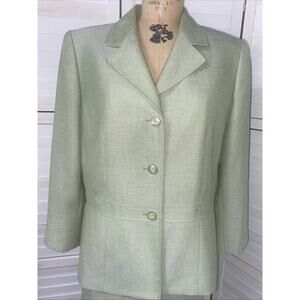 Two matching pieces. Light green. 100% polyester outer and satin lining. Single breasted, 3 buttons. Medium weight shoulder pads.